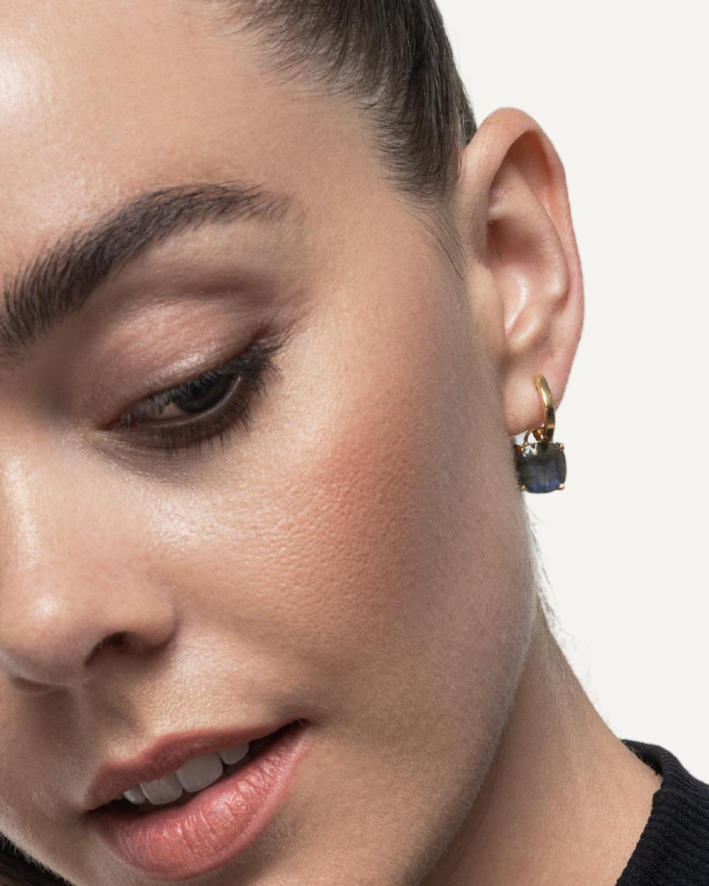 Add this earring charm to your Duo hoop collection and make a classic style investment. This natural radiant cut gemstone changes colour as you move, throwing earthy colours of blues and browns, each charm uniquely different. The gemstones are securely nestled within a delicately crafted setting, allowing their natural beauty to take centre stage. The simplicity of the charm's setting, designed to let light in from all angles, enhances the luminous play of colours.