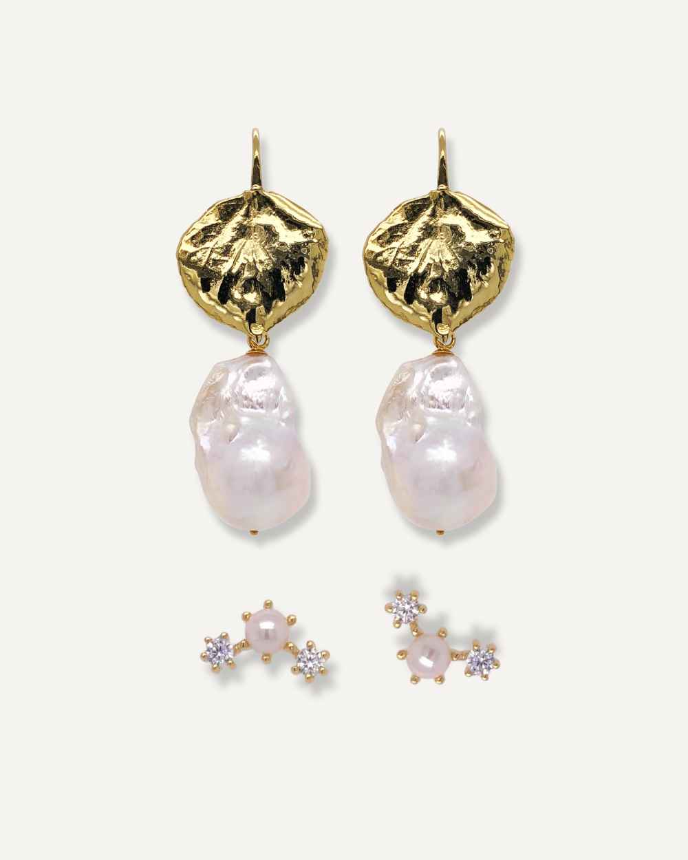 You've got plans and our Statement earring stack will take you there! This curated earring stack features our Ava large baroque pearl earrings, accompanied by the Constellation earring studs.