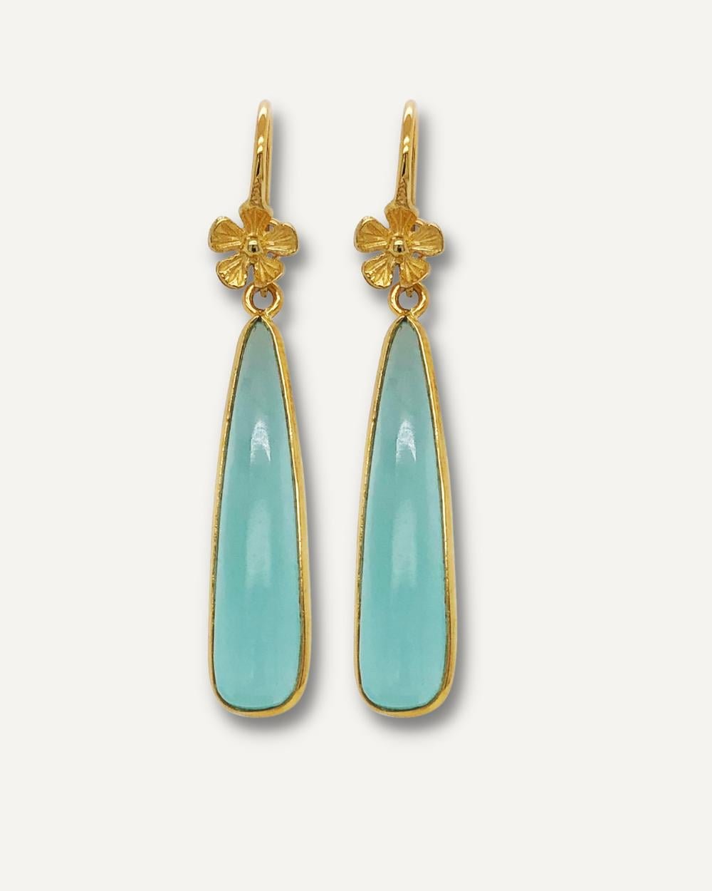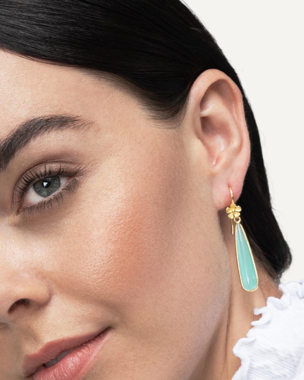 Fleur aqua chalecedony gemstone earrings effortlessly transition from daytime elegance to evening sophistication. Pair them with a sleek dress for a formal event, or combine Fleur with a tailored shirt and pants for a chic workday ensemble.