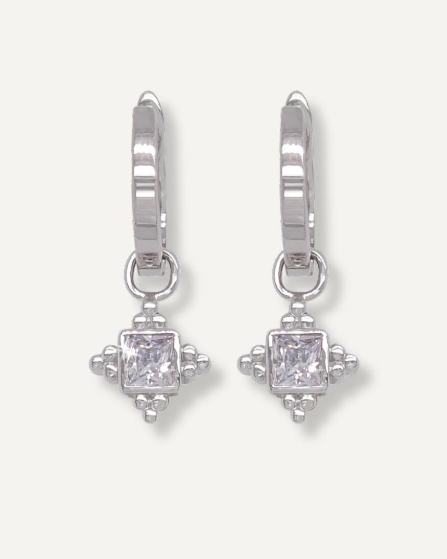 Elevate any outfit with Duo Lulu hoop charm earrings. The brilliant cut sparkling diamond simulant set in the centre of each detachable charm catches the light as you move giving plenty of sparkle.