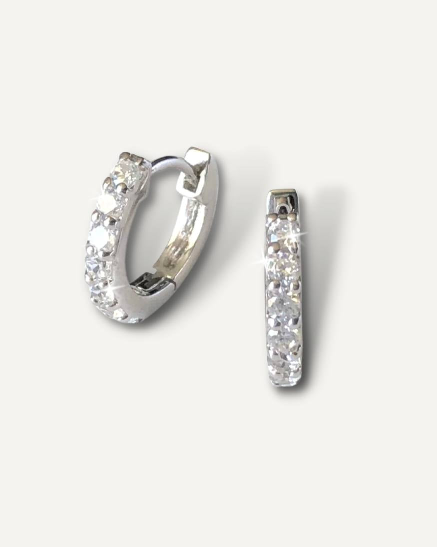Add the finishing touch to your outfit with our Mana huggie hoops. 7 brilliant cut diamond simulants deliver a whole new level of shine in these huggie hoop earrings. Elevate your style effortlessly with the exquisite sparkle of Mana hoop earrings.