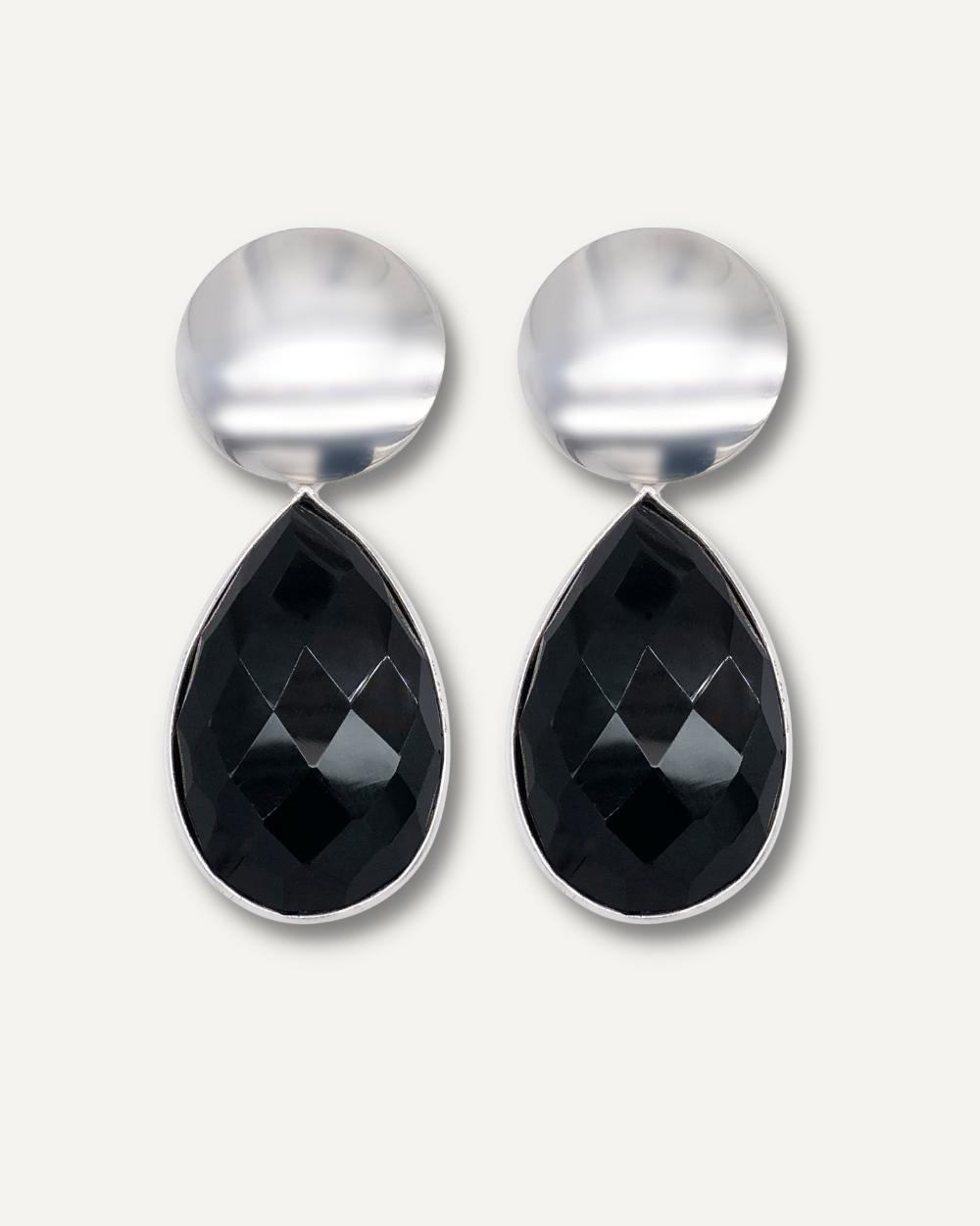 A shiny polished silver disc is offset by a pear shaped natural black onyx gemstone drop. When you’re in the mood to make a statement in that off the shoulder top, these earrings are the perfect accessory evoking an air of sophistication with just a touch of edge.