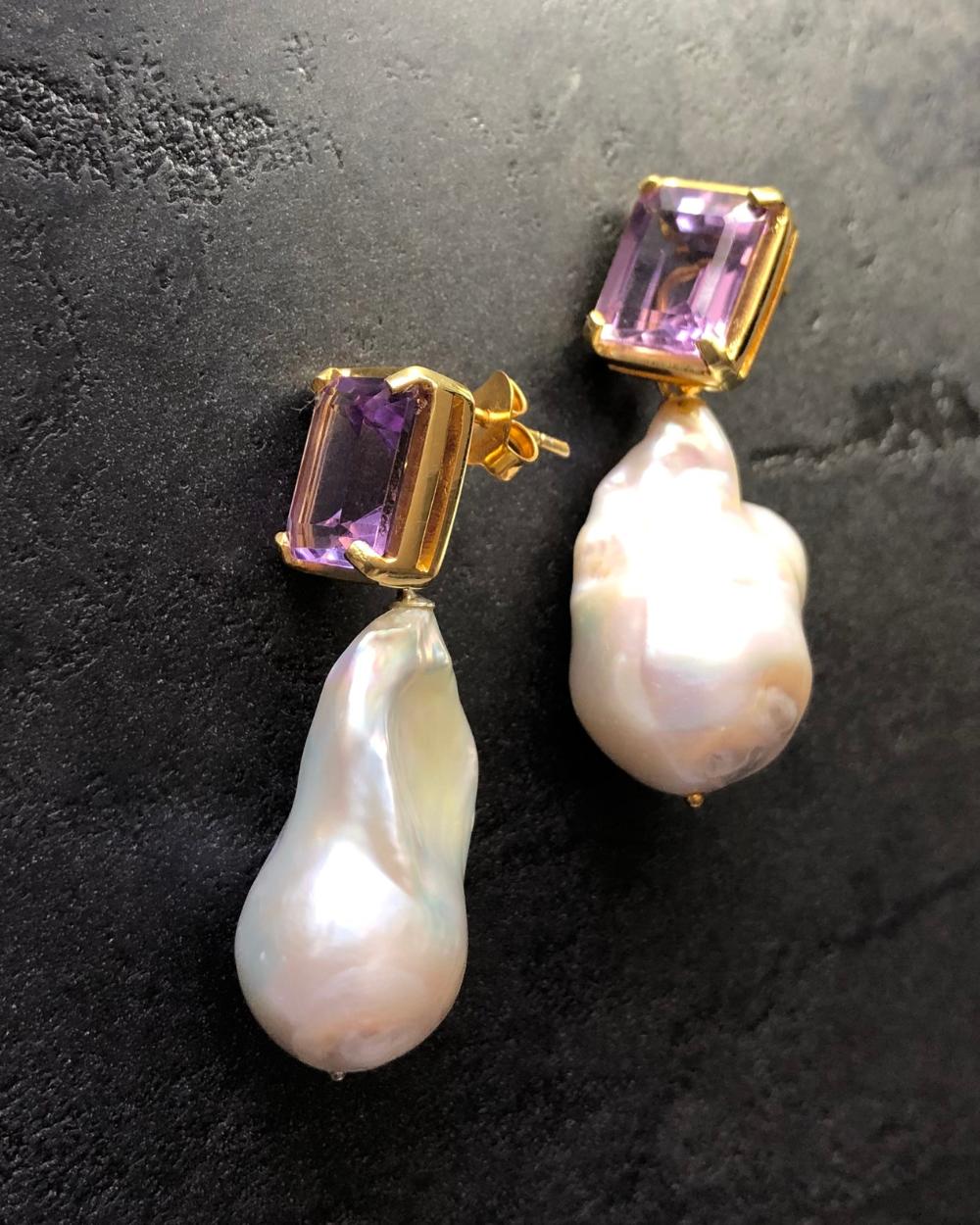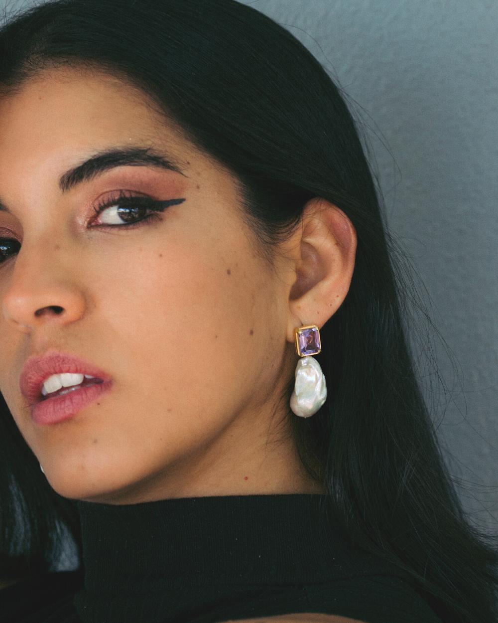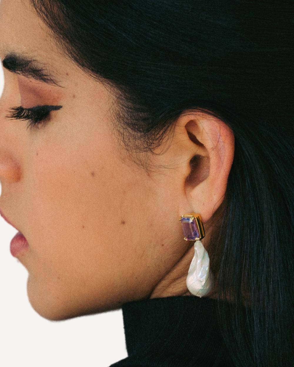 When you need to get your ‘royalty’ on, our Monarchy pearl and amethyst earrings are your go to. Large baroque pearls hang from the emerald cut natural amethyst. Remove the detachable pearl drop for a simpler but still stunning look with a single amethyst stud.